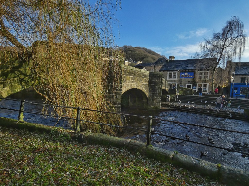 The Old Bridge. Two of its arches span the Hebden Water, the third was built to span the tail goit of Bridge Mill, now culverted under the riverside walk.