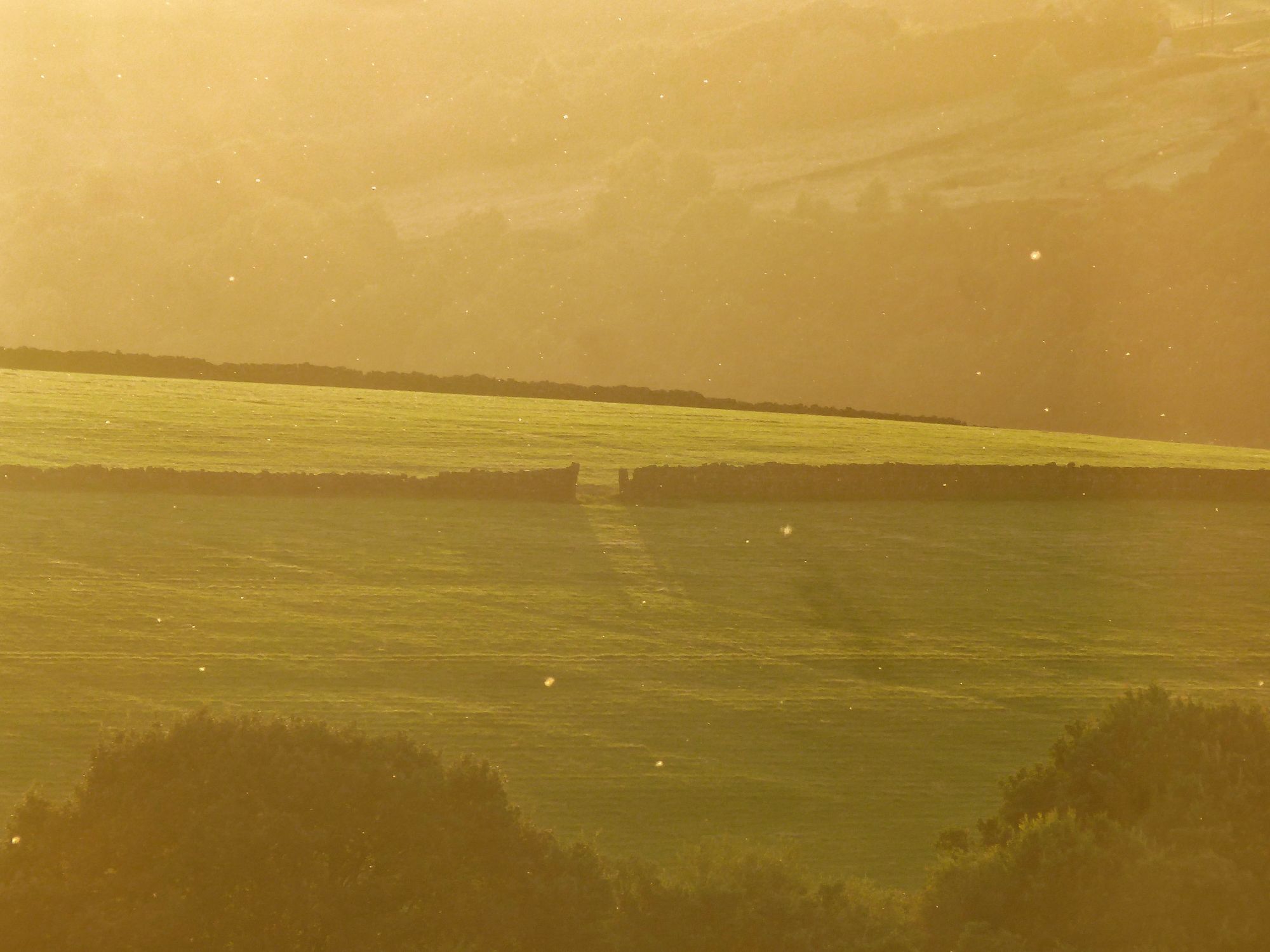 Through August’s intermittent heat, we watched the mowing and baling of a succession of Erringden meadows. At the beginning of the month, we set off to climb through Callis Wood in the morning to see Far Meadow being mown, but were detained for a while at Rawdon Lock’s wide winding hole by a strange spectacle. The canal’s waters here were shaded apart from a single dapple of sunlight that made it through the fringe of sycamores, and in this bright spotlight hundreds of pond skaters were gathered. They were evenly spaced upon and entirely filled the area of their golden island that floated among the brown murk, but as the water on which they were suspended slowly slid by, they were inexorably dragged towards the shadows beyond the shore. Yet as each of the downstream skaters sensed shade, they strode forward among their fellow islanders, and the overall effect was of a single organism rippling ever onwards while remaining stationary in space. It was mesmerising, and we stood transfixed for some time, before remembering our objective and resuming the ascent. Up past tight green knots of nascent blackberries, stepping over that night’s badger latrines and to the clatter of indignant wood pigeons who had been plumping themselves on sorrel seeds in the long grass as if they knew the mower was on its way, we emerged into the sun at Cruttonstall to admire the steady, methodical progress of the tractor combing the meadows into windrows, and to give a wave and a thumbs-up as we passed by. In the afternoon, I climbed the opposite side of the valley with a friend to watch those windrows being swept up and spun into big round bales while the cattle stood by on the other side of the ancient walls and black-headed gulls stalked across the pale shorn swath as if it had been cleared specially for them. A few weeks later we climbed again, above Lower Rawtonstall to where David was rowing up at Pry, and from which during the course of our walk we watched the Moor Field on the shoulder of Edge End Moor and then Flat Field atop Callis Nab being baled. And at the end of the month, there was still time for a final cut at Horsehold, and through the early morning haze from Winters I watched the windrows being rearranged into widely-spaced rows ready for the forage harvester.