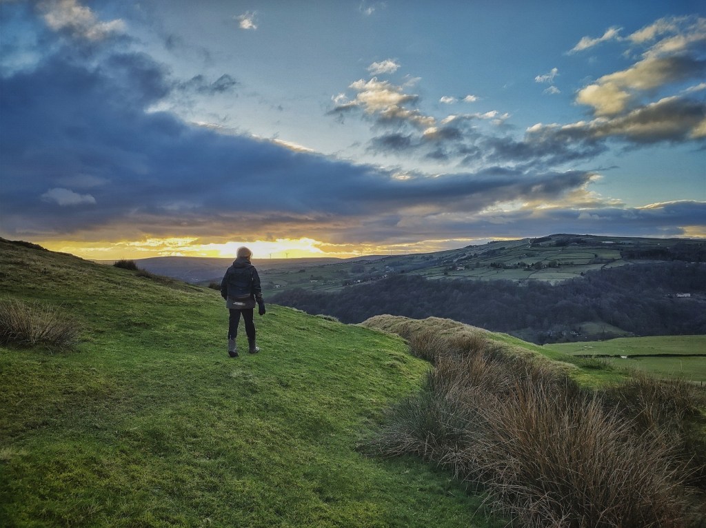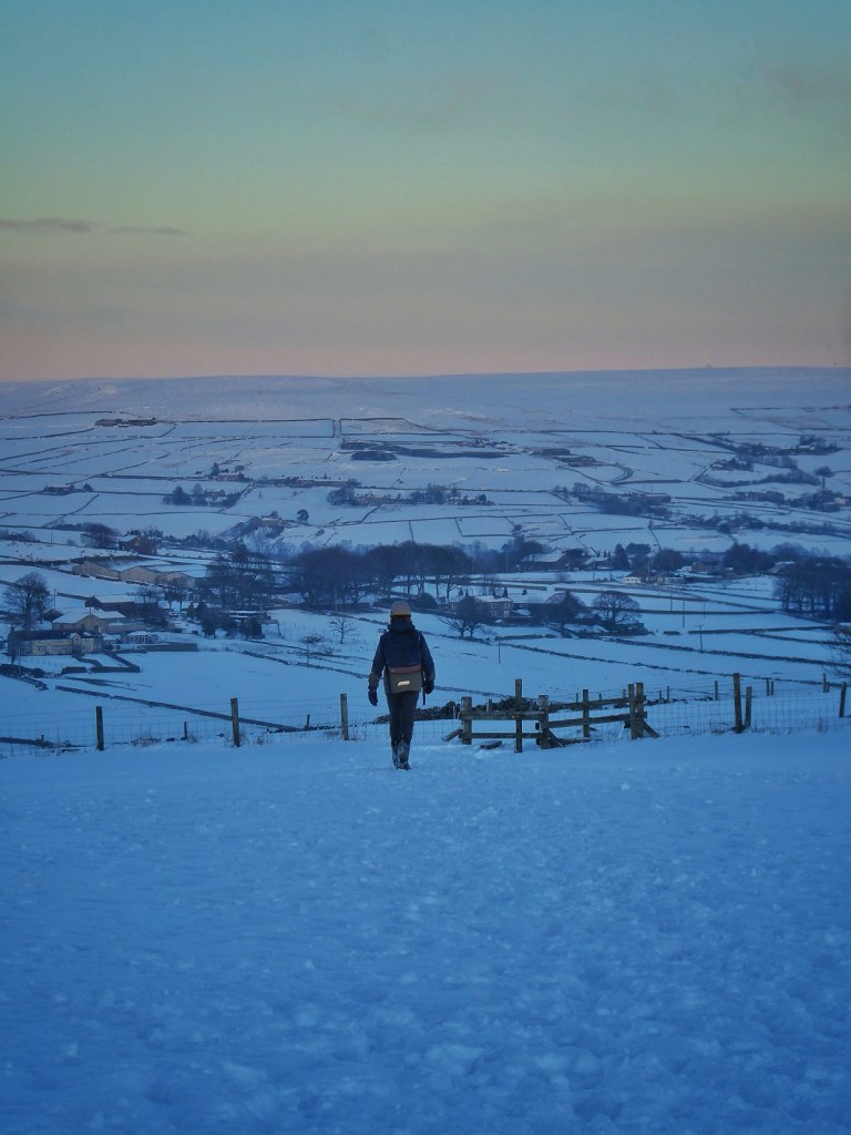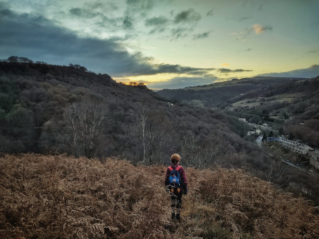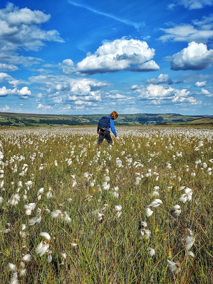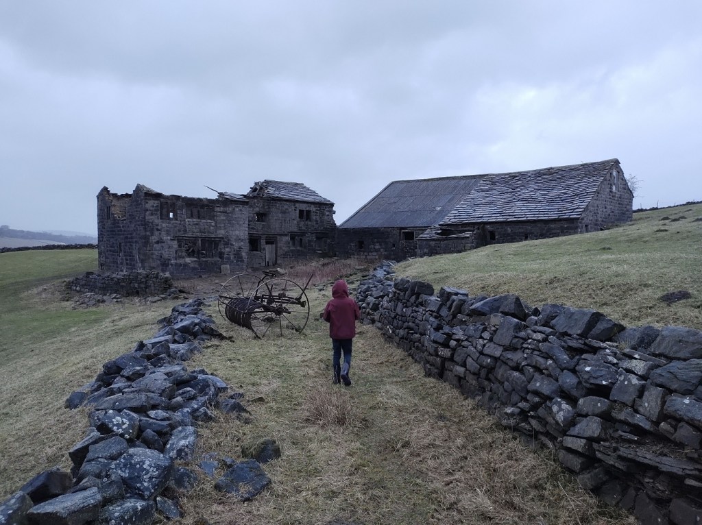 Back up the hill with us. It’s at this point, in the heat of the afternoon, that I’ve been so thankful that we have the cool woods to save us from a blazing walk along the road. Although often, if it’s nice, we have gone on a longer walk home – usually once a week, so we must have done a good few hundred through the years. I always like the ones where we set ourselves up with a mission, be it to trace a stream to its source, or to catch the cotton grass in full bloom on Erringden Moor, or to watch the earliest midwinter sunset from the crags at the top of Eaves Wood, or to search for the lost Anglo-Saxon Mandike Stones among the high pastures of Erringden, or to give the last birch tree in Horsehold Wood to hold onto its autumn leaves a congratulatory pat, or we used to quest up to Old Chamber for the treasure of Just Jenny’s ice cream in Ann’s Honesty Box hut. Sometimes we would go further afield – up to Old Town to see the lapwings, or all the way up the Colden Valley to May’s Shop for a sweet treat. But more often, we just enjoy a meander up the hill to our favourite spots: a sit on the bench at Horsehold Scout, a wander into the setting sun along Pinnacle Lane, an explore along the escarpment of Dill Scout. We almost always end up in one of two places – either wading through the meadows around the ruin of Cruttonstall if we’re on the south side of the valley, or at the gate below Lower Rawtonstall if we’d looped round to the north. I’d always bring a snack, and we’d sit and munch and look at the view. But not today. We’ll tread this old path home, but perhaps, if it’s OK, we’ll go a little slower than usual.