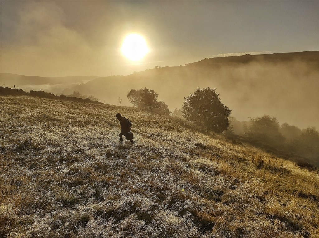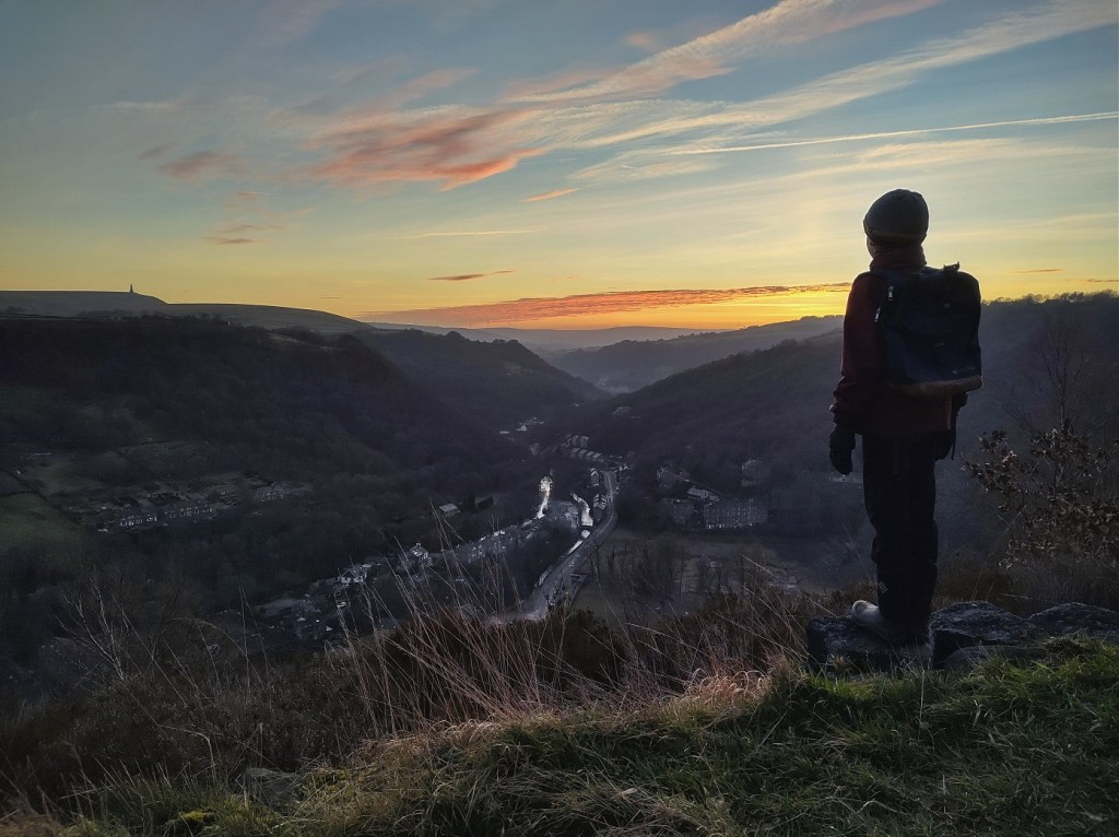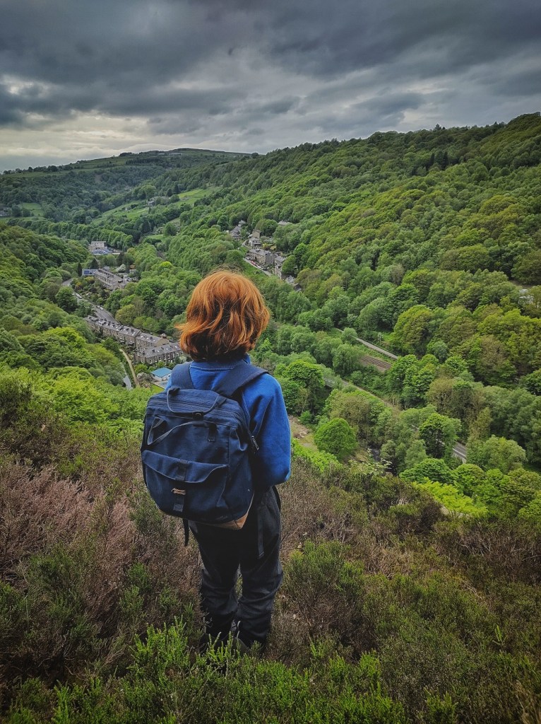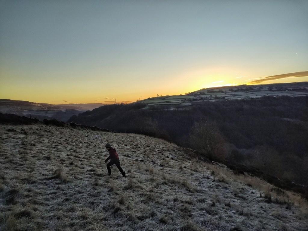 Back up the hill with us. It’s at this point, in the heat of the afternoon, that I’ve been so thankful that we have the cool woods to save us from a blazing walk along the road. Although often, if it’s nice, we have gone on a longer walk home – usually once a week, so we must have done a good few hundred through the years. I always like the ones where we set ourselves up with a mission, be it to trace a stream to its source, or to catch the cotton grass in full bloom on Erringden Moor, or to watch the earliest midwinter sunset from the crags at the top of Eaves Wood, or to search for the lost Anglo-Saxon Mandike Stones among the high pastures of Erringden, or to give the last birch tree in Horsehold Wood to hold onto its autumn leaves a congratulatory pat, or we used to quest up to Old Chamber for the treasure of Just Jenny’s ice cream in Ann’s Honesty Box hut. Sometimes we would go further afield – up to Old Town to see the lapwings, or all the way up the Colden Valley to May’s Shop for a sweet treat. But more often, we just enjoy a meander up the hill to our favourite spots: a sit on the bench at Horsehold Scout, a wander into the setting sun along Pinnacle Lane, an explore along the escarpment of Dill Scout. We almost always end up in one of two places – either wading through the meadows around the ruin of Cruttonstall if we’re on the south side of the valley, or at the gate below Lower Rawtonstall if we’d looped round to the north. I’d always bring a snack, and we’d sit and munch and look at the view. But not today. We’ll tread this old path home, but perhaps, if it’s OK, we’ll go a little slower than usual.
