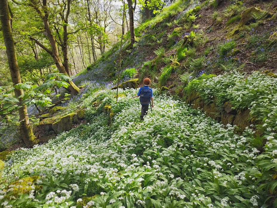 Goodness, I love the scent of these privet flowers. Get your nose in that. It must have escaped into the woods from the garden up there. But most of the plants we pass are wild and native: the buckler ferns waving in the breeze, the hooked seeds of wood avens grasping at our legs, the foxglove flowers leaning out over the path, the bracken back there that almost submerges you, the hogweed and enchanter’s nightshade, the woodrush and bilberry and bindweed. Best of all, the bluebells, for which we always pick a fine May afternoon every year to take an extra long tour around our favourite spots when we judge they are at their peak of perfection.