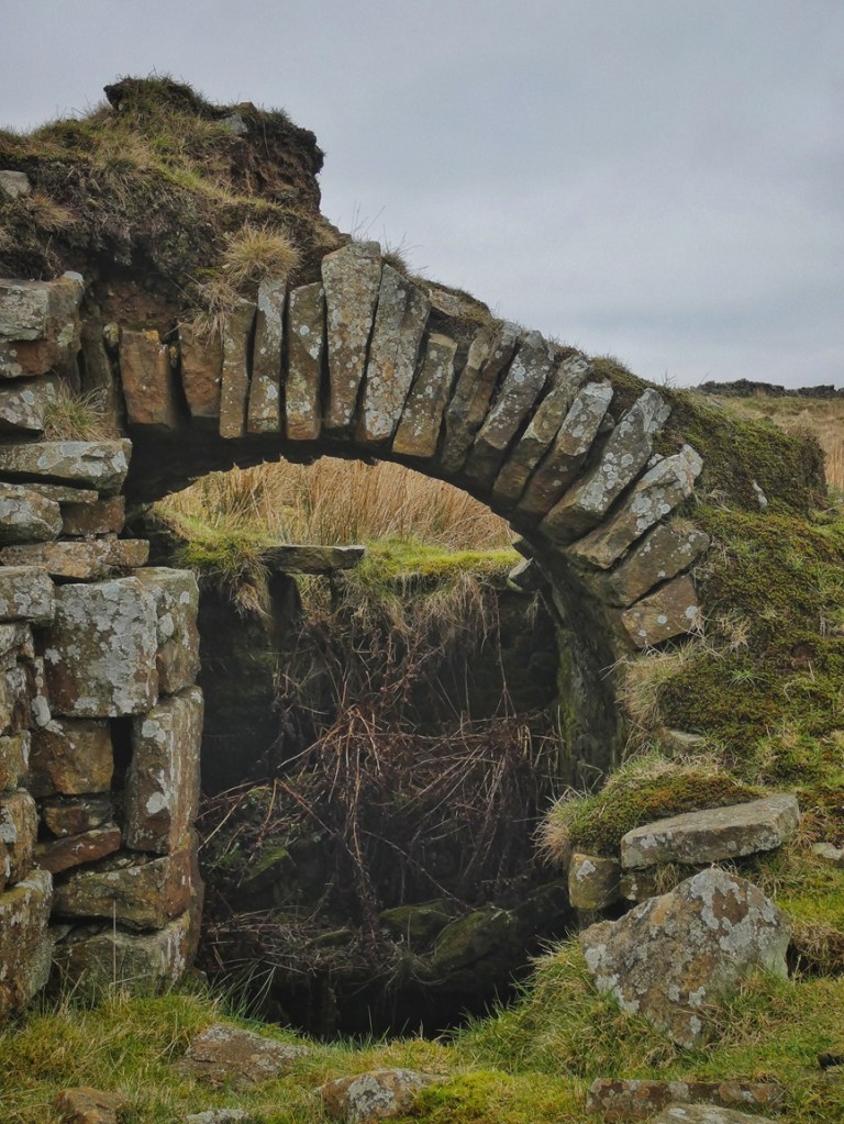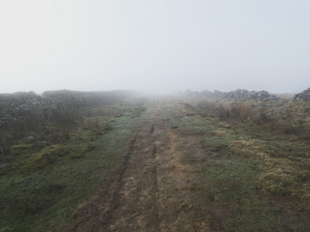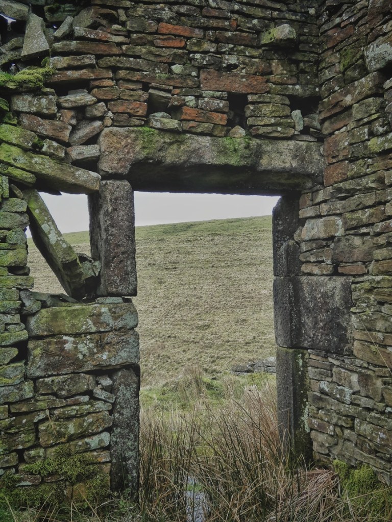 A pair of gate stoops guides the non-path to nowhere. One stands like a megalith, the other has fallen, its mortise holes weathered into prehistoric cup and ring marks, the final wooden rail that once slotted into them rotting in the morass.