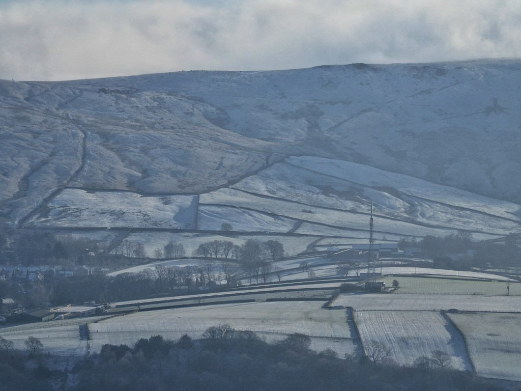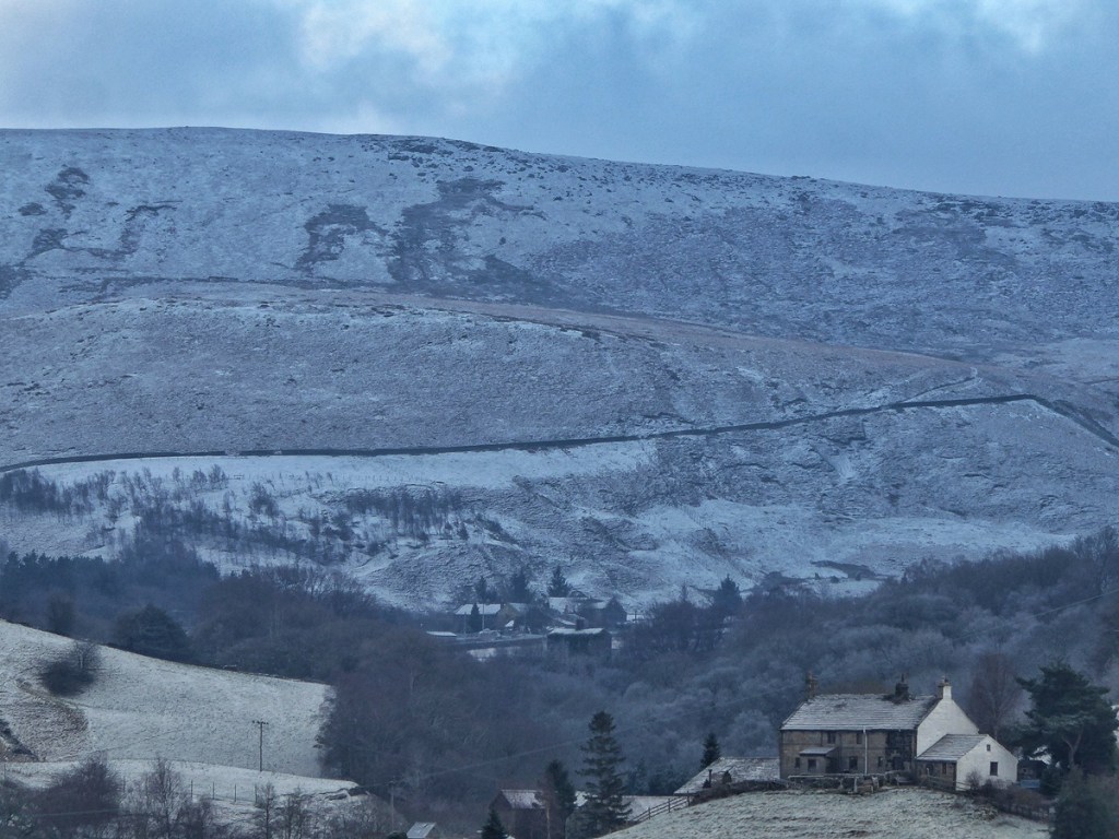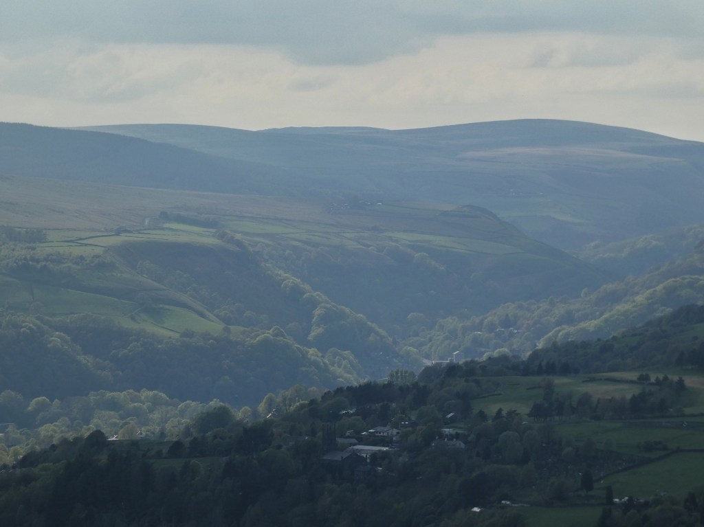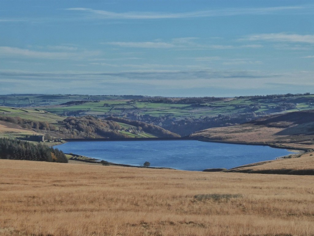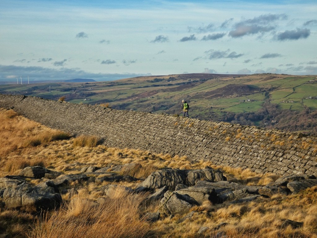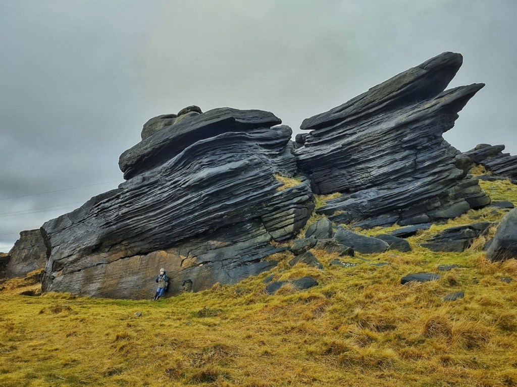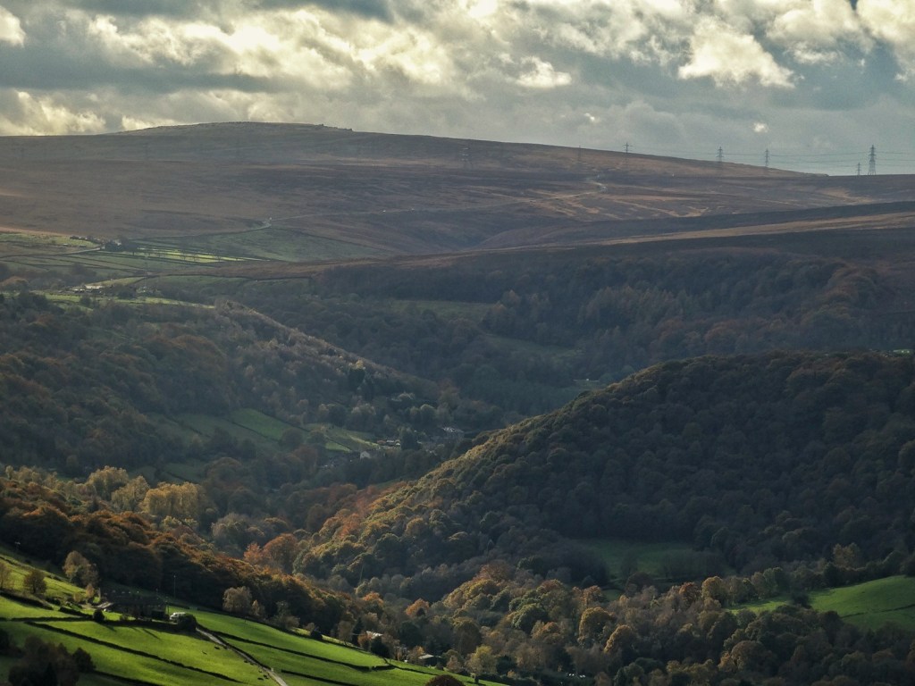 Another layer of Hebden Formation then rises again above London Road and Kilnhirst Lane towards Stoodley Pike and Erringden Moor, before a further step is then reached, the moor being capped with another layer of Millstone Grit – Lower Kinderscout Grit around the escarpments of Langfield Edge just under Gaddings Dam and all across Blake Moor towards White Holme and Blackstone Edge reservoirs, and then Upper Kinderscout Grit crowning Stoodley Pike, and stretching across Erringden Moor. On the south and east sides, the bowl of Withens Clough and the scoop of Broadhead Clough have formed because softer layers of mudstones in these areas were more easily eroded than the Millstone Grit layers that enfold them.2
