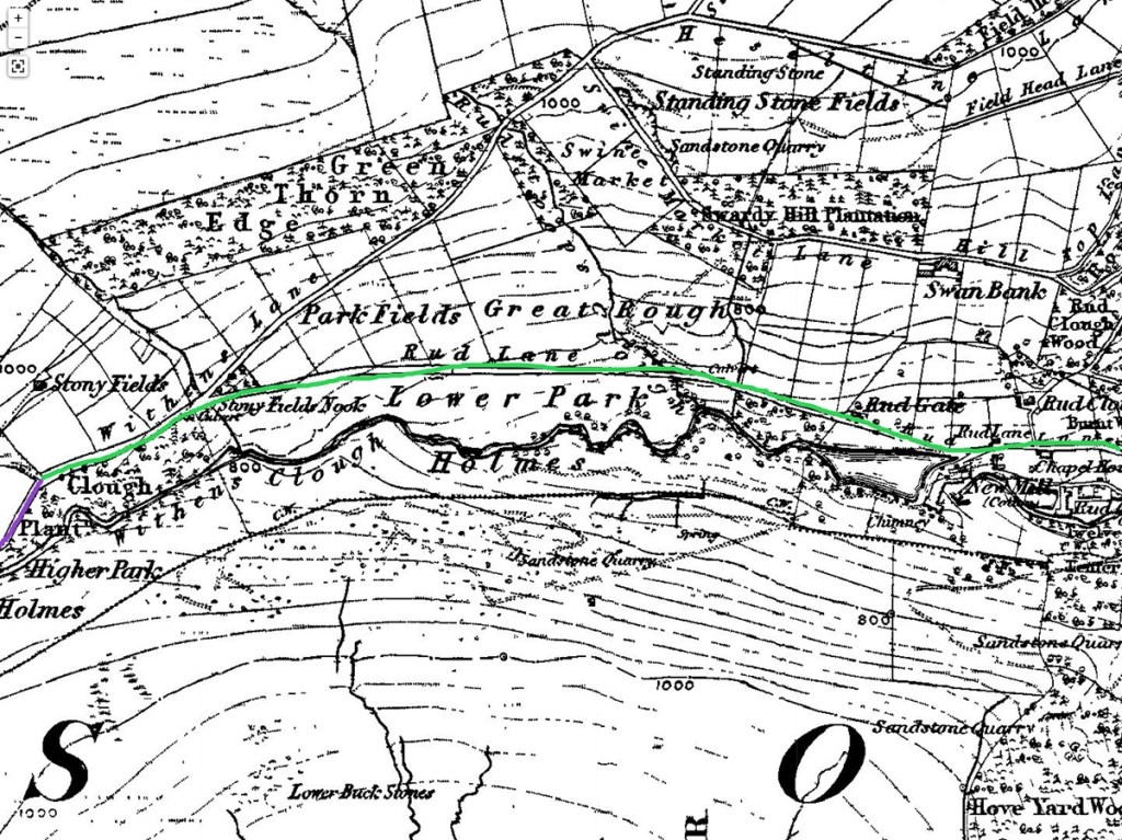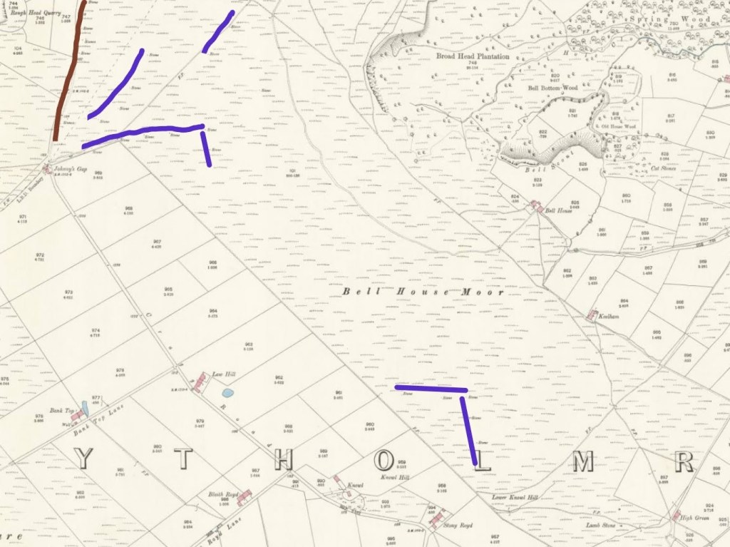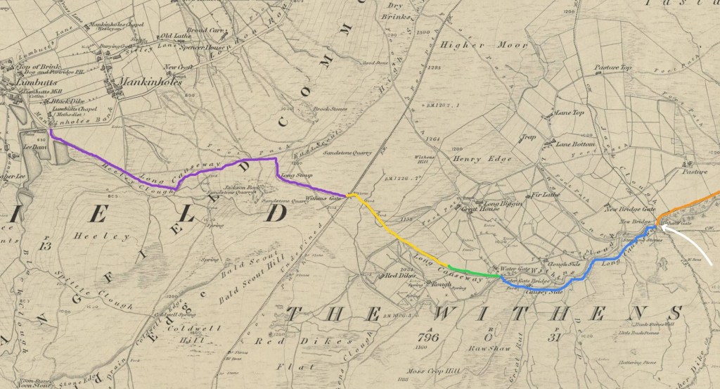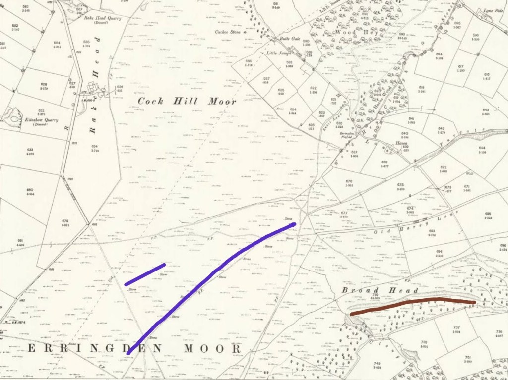 Of this five and a quarter miles, all but a 500-yard stretch from Johnny Gap to the top of Whittaker Lane, and a 420-yard stretch down the last steep descent of Cock Hill Moor and across the fields above Old Chamber, almost to the top of Spencer Lane, have been obliterated by time.