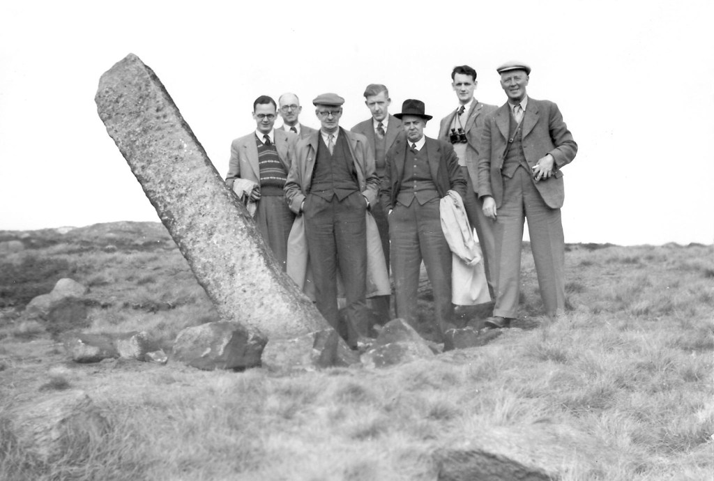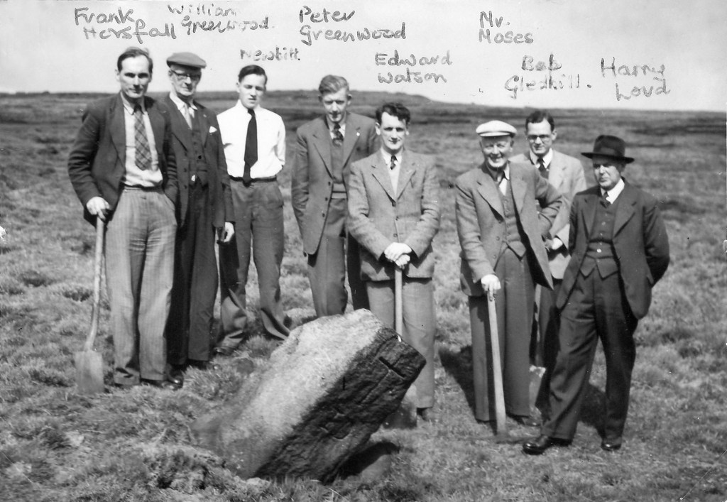 There are many other stones placed by our ancestors across the moors. The Long Stoop is an impressive ancient waymarker beside the Long Causeway above Lumbutts, a monolith nine-foot tall, though leaning quite alarmingly. This lean, however, is not new; a photograph of members of the Hebden Bridge Local History Society standing beside it in 1956 shows it at the same angle.