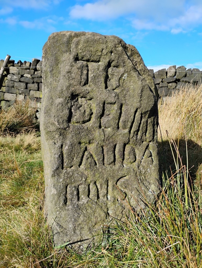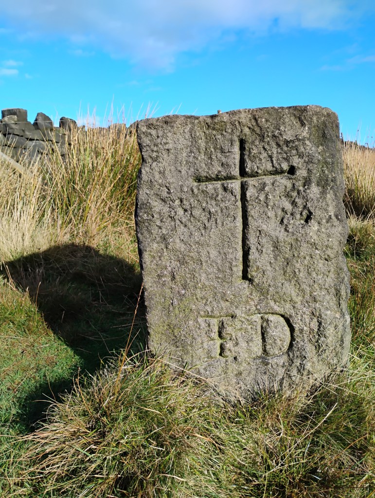 Eight of these stones run in a line beside the remnant of the Mandike from Johnny Gap to the top of Whittaker Road. Four run in another line north-east from Johnny Gap, and another line of 11 seem to pick up their thread, but slightly offset. Two are free-floating to the north of this line, and another to the south. The remainder – a set of six and another set of five – form two headlands jutting out from the enclosures south of Johnny Gap, and are apparently older boundaries of ownership prior to this area’s taking in from the moor in the 1830s.24 (There are ditches and banks visible on Lidar maps that align with these shapes, and my son discovered a short stretch of raised causeway on the line of the southern one.) Most of the stones are blank, but some on the line of 11 (or perhaps 15) are carved with letters – ‘A’, possibly for the older spellings of Erringden (e.g. Ayrykedene), and ‘S’, presumably for Sowerby, the township that was to the east before Erringden was enlarged.
