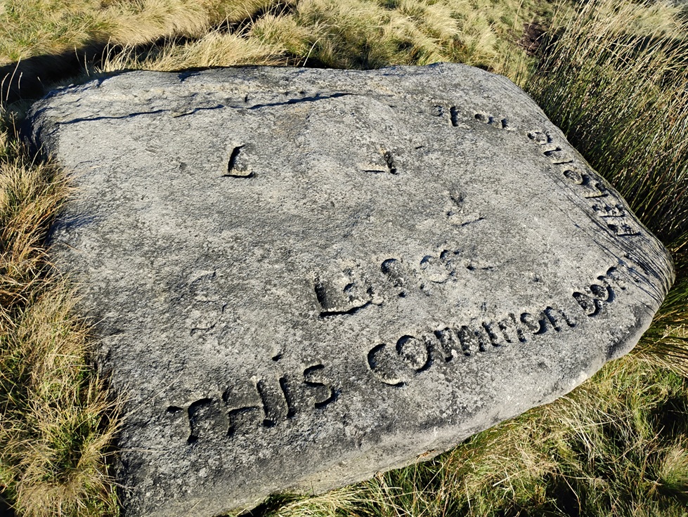 During the 19th century the boundary of Langfield Common was surveyed and marked several times, leaving a legacy of boundary stones across the moor. In 1840, after a long dispute over grazing and encroachment, the Langfield freeholders (of which more later) perambulated the boundary and set out positions for 25 painted and numbered boundary stones to divide Langfield Outpasture from Withens and Turley Holes Moss.25 A year later, a further 12 stoops were jointly erected to mark the newly-agreed boundary between Langfield and the Turley Holes estate of Christopher Rawson, each inscribed with an ‘L’ for Langfield and an ‘R’ for Rawson.26 These stones, substantial blocks of grit sunk deep into the peat, can still be traced on the moor, though only one remains standing. When the Ordnance Survey resurveyed the area in 1890 they recorded additional marked stones around Gaddings Dam, evidence of further markings of the boundary line, this time abutting the Manor of Rochdale. There is also a flat rock on Red Dikes Flat inscribed ‘This common doth belong to L…’, with the rest of what must have been ‘Langfield’ having been defaced. Together these scattered stones bear witness to a century of attempts to fix in stone what had long been disputed in custom and memory.